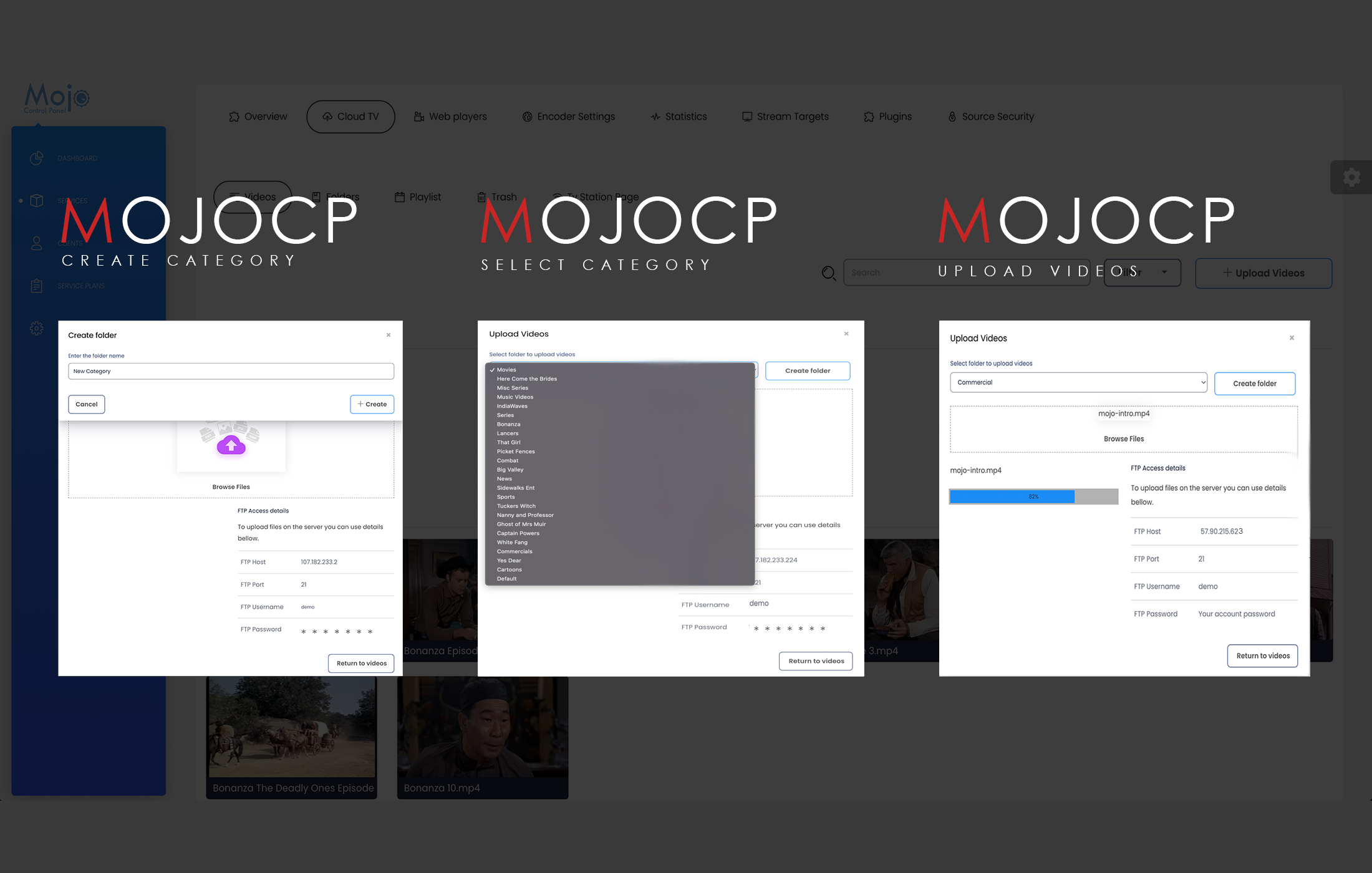 - From the MojoCP Videos Tab launch the file manager upload interface to upload file(s)
