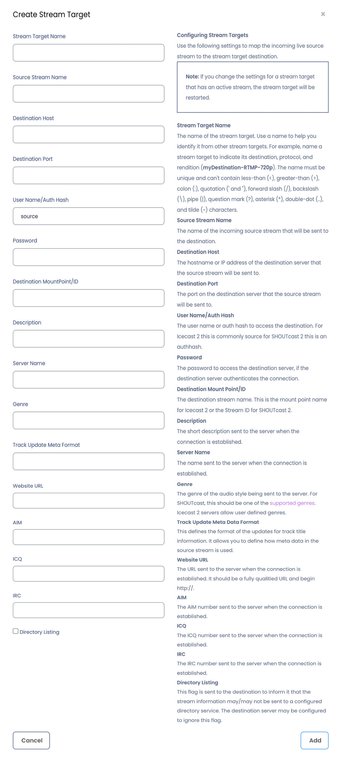 Note: If you change the settings for a stream target that has an active stream, the stream target will be restarted.