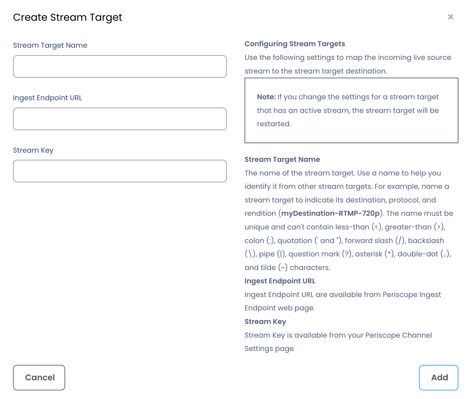 Note: If you change the settings for a stream target that has an active stream, the stream target will be restarted.