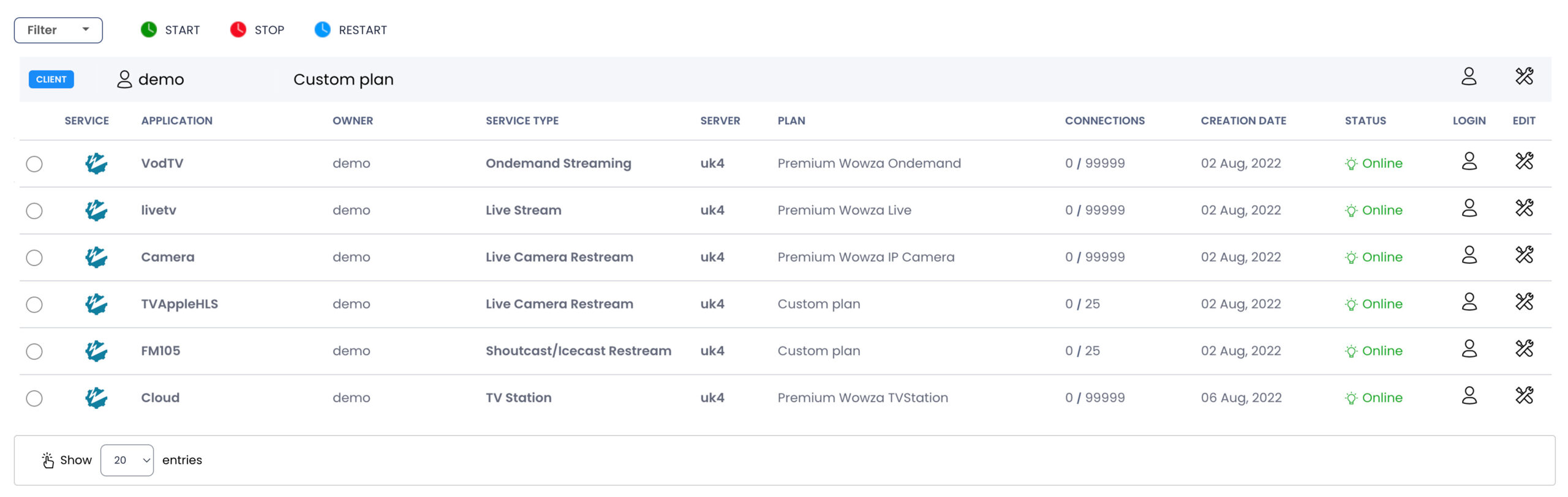 By clicking on the PLAN item under Services, you can view details about your streaming plan, such as the service types included in your plan (e.g., Live, On-demand, CloudTV Station), the amount of storage and bandwidth allocated to your plan, the number of channels and viewers allowed, and other plan-related information.