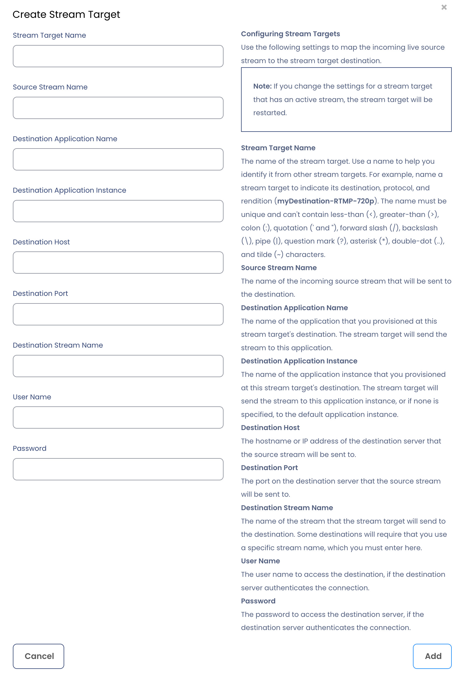 The name of the application that you provisioned at this stream target’s destination is ( live2). The stream target will send the stream to this application. - 7 Destination Application Instance (leave this blank)