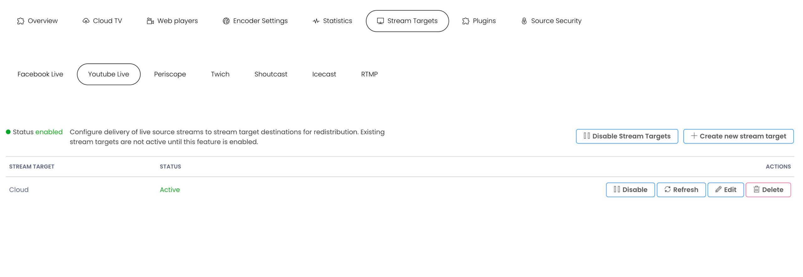 This article explains how to configure YouTube on MojoCP so that you can send a single live stream to the YouTube Live network for distributed delivery. Existing stream targets are not active until this feature is enabled.
